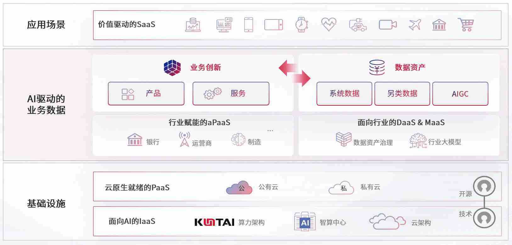 数字时代,,,围绕企业数字化转型的关键要素,,,AG尊龙凯时数码开创性的提出数云融合战略和技术体系框架,,,,着力在云原生、、、、数字原生、、、AI原生和信创产业上架构产品和服务能力,,,,为处在不同数字化转型阶段的快消零售、、、、汽车、、、、金融、、、医疗、、、、政企、、、教育、、、运营商等行业客户提供泛在的敏捷IT能力和融合的数据驱动能力,,,,构建跨界融合创新的数字业务场景和新业务模式,,助力企业级客户建立面向未来的核心能力和竞争优势,,,,全面推动社会的数字化、、、、智能化转型升级。。。