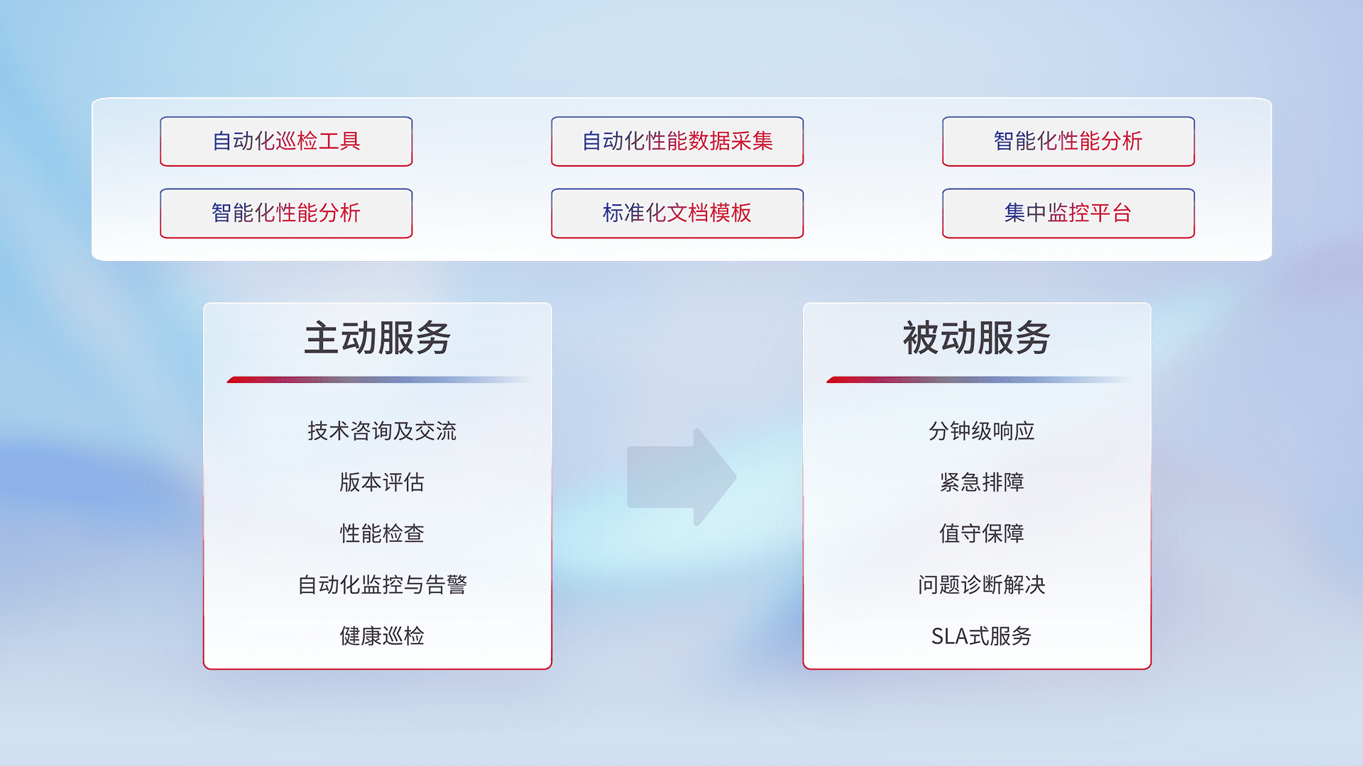 智能化工具和标准化文档,,,,保障服务质量,,,提供主动服务(包含技术咨询、、、、版本评估、、、、性能检查、、、、自动化监控与告警、、健康巡检)和被动服务包含(分钟级响应、、、、紧急排障、、、、值守保障、、问题诊断解决、、、、SLA服务)。。。。